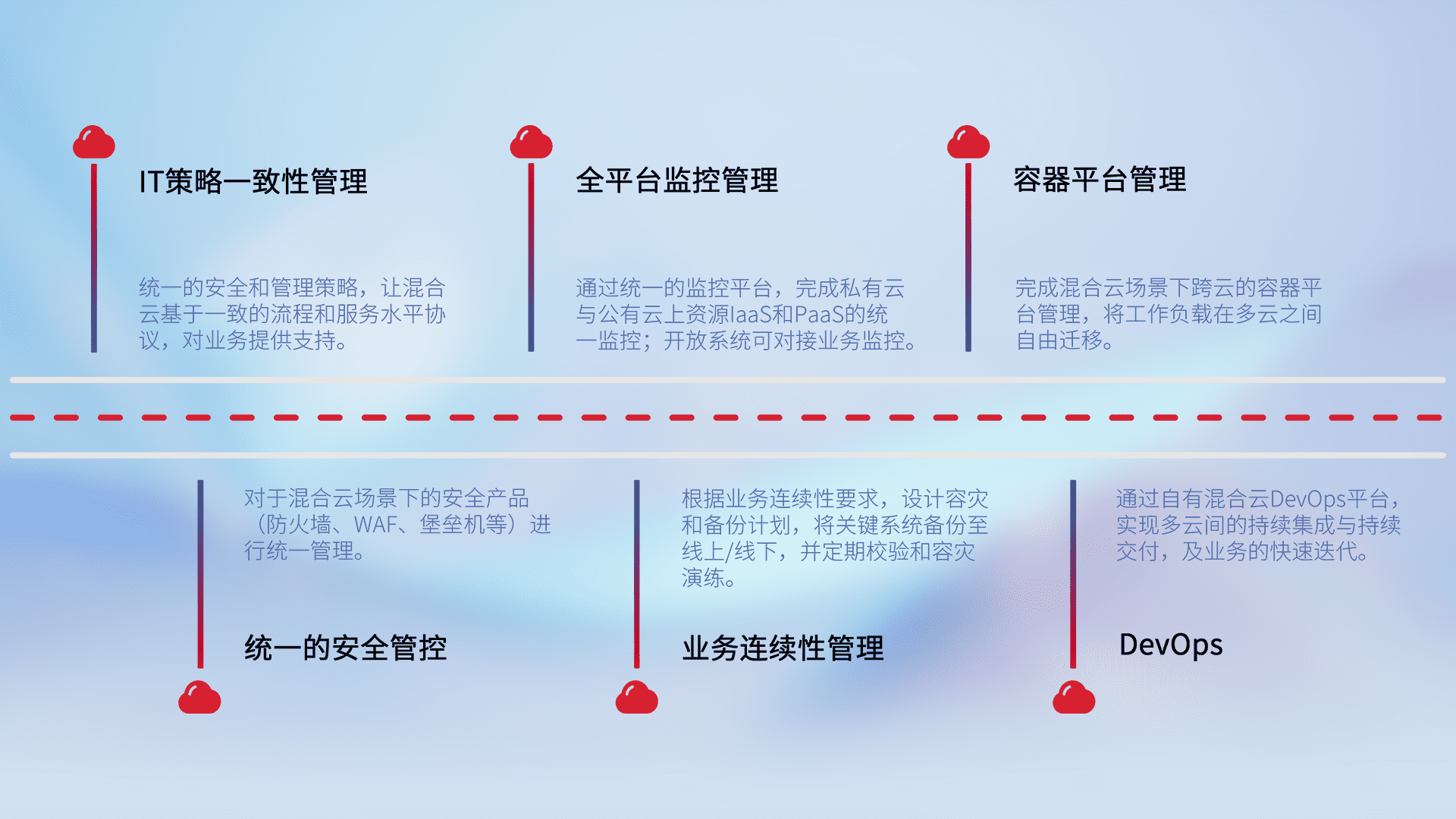通过多云纳管,,,以统一的资源数据模型把客户的云资源进行抽象和封装,,,,进而实现对多云资源的统一操作,,保障云资源管理的可靠性、、稳定性与可用性。。量身定制化运维内容,,配置、、开发运维、、补丁管理、、备份、、、、监控、、、认证和访问管理、、、审计和日常巡检等,,保障在用云过程中的可靠度,,,,稳定度以及高可用率。。。。